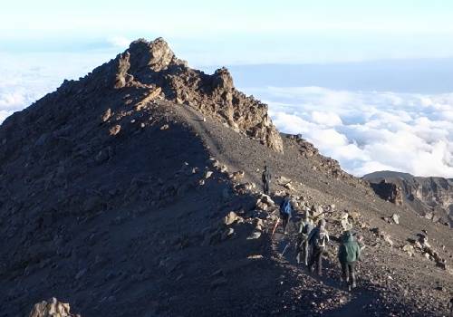 We start early at around 1:30 a.m. to climb steeply to Rhino Point (3,800 m.) and onto Cobra Point (4350m). There is a possibility to see Kilimanjaro Peak above the clouds. The final part of the climb is along a spectacular narrow ridgeline between the sheer inner cliffs and the crater’s sloping outer wall. We reach the summit (4,566 m) on time for sunrise.
